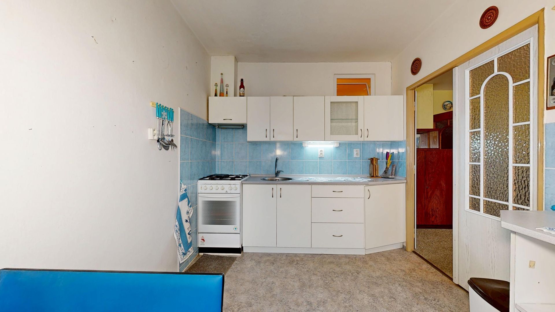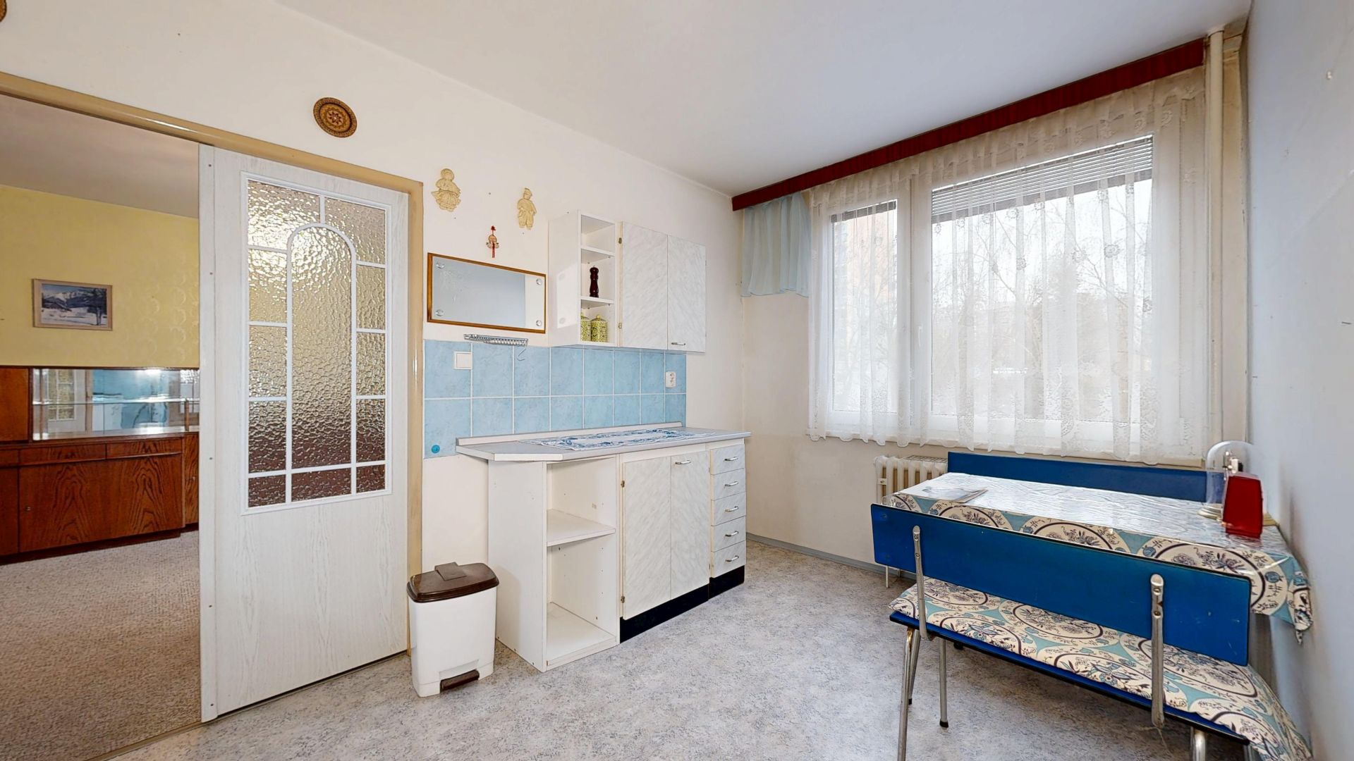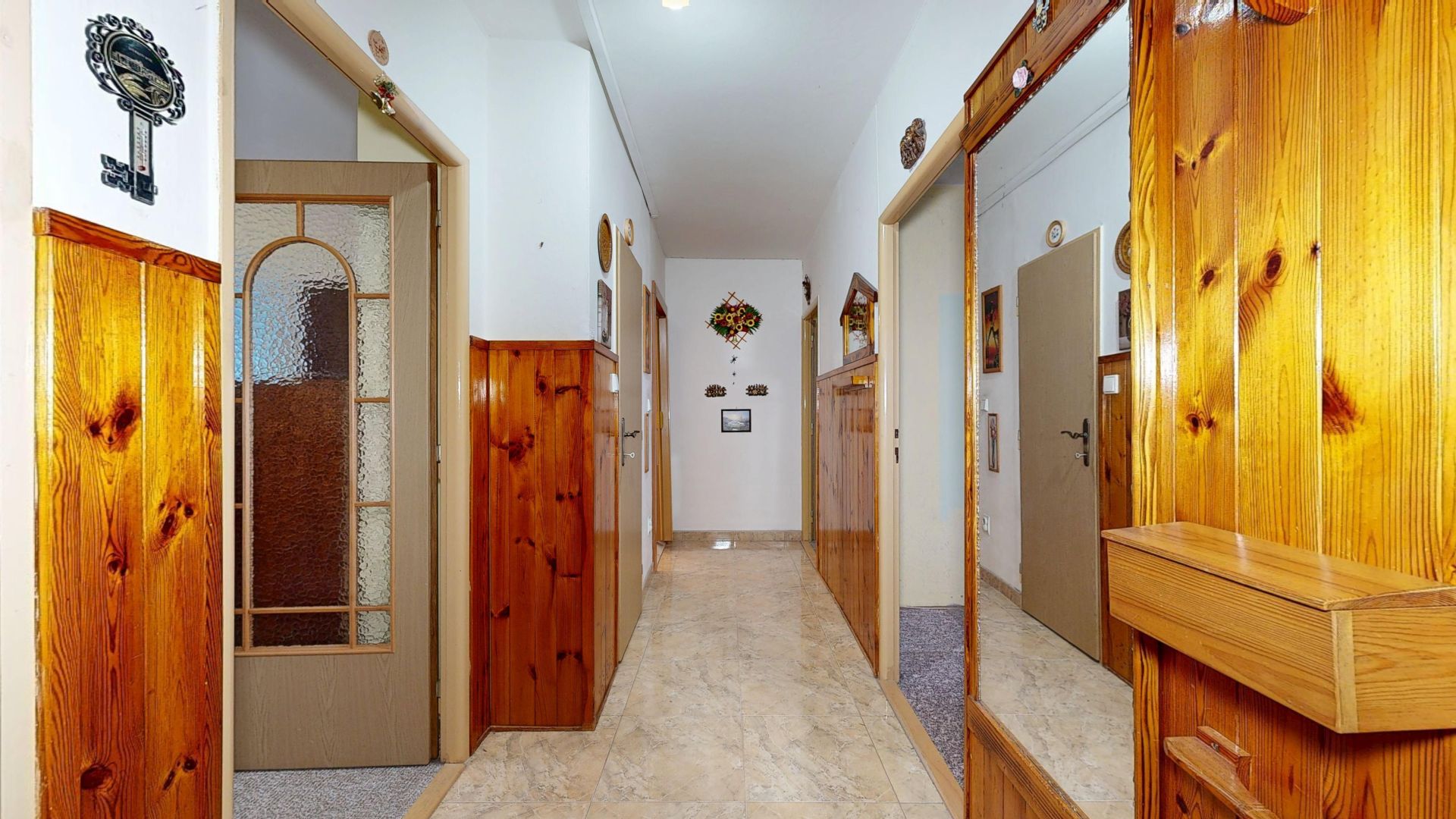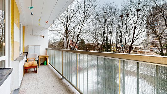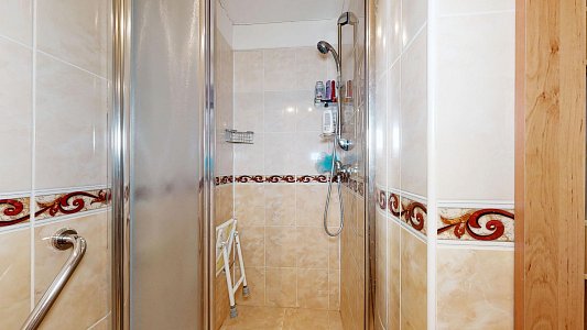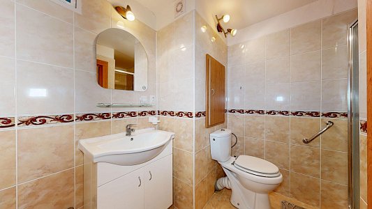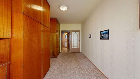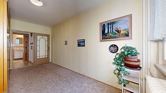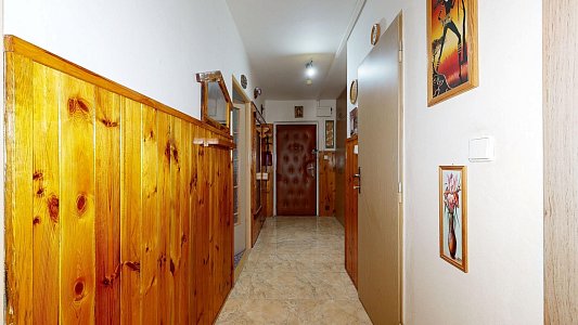 Interiér bytu je velmi dobře udržovaný. Podlahy jsou řešeny kombinací dlažby a plovoucí podlahy, což zajišťuje nejen příjemný vzhled, ale i snadnou údržbu. V chodbě byla nově položena dlažba, která dodává prostoru elegantní a čistý dojem. Byt disponuje zděným jádrem a nově zrekonstruovanou koupelnou. Praktickým benefitem je komora přímo v bytě a další komora umístěná na společné chodbě, která poskytuje další úložný prostor.