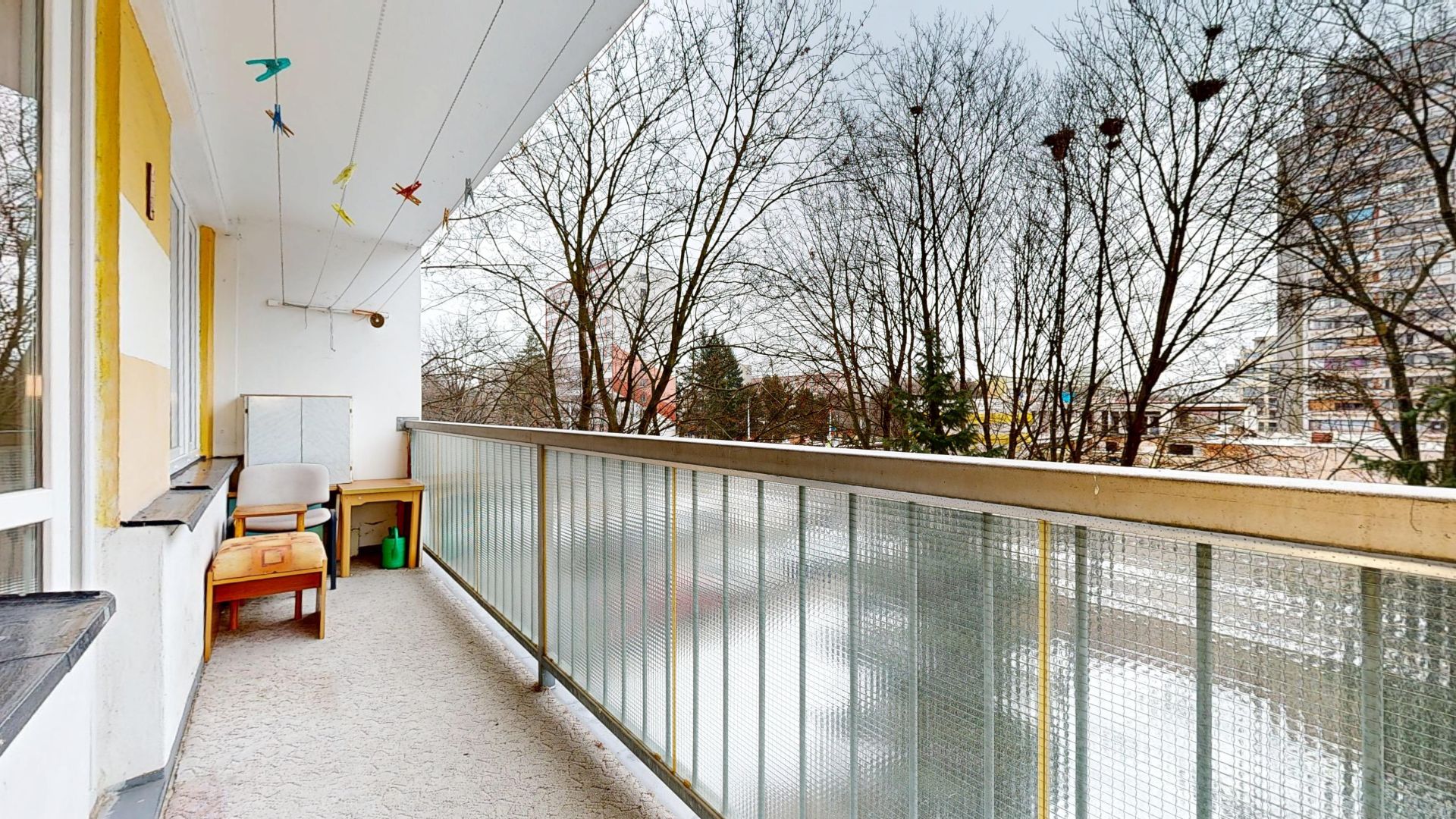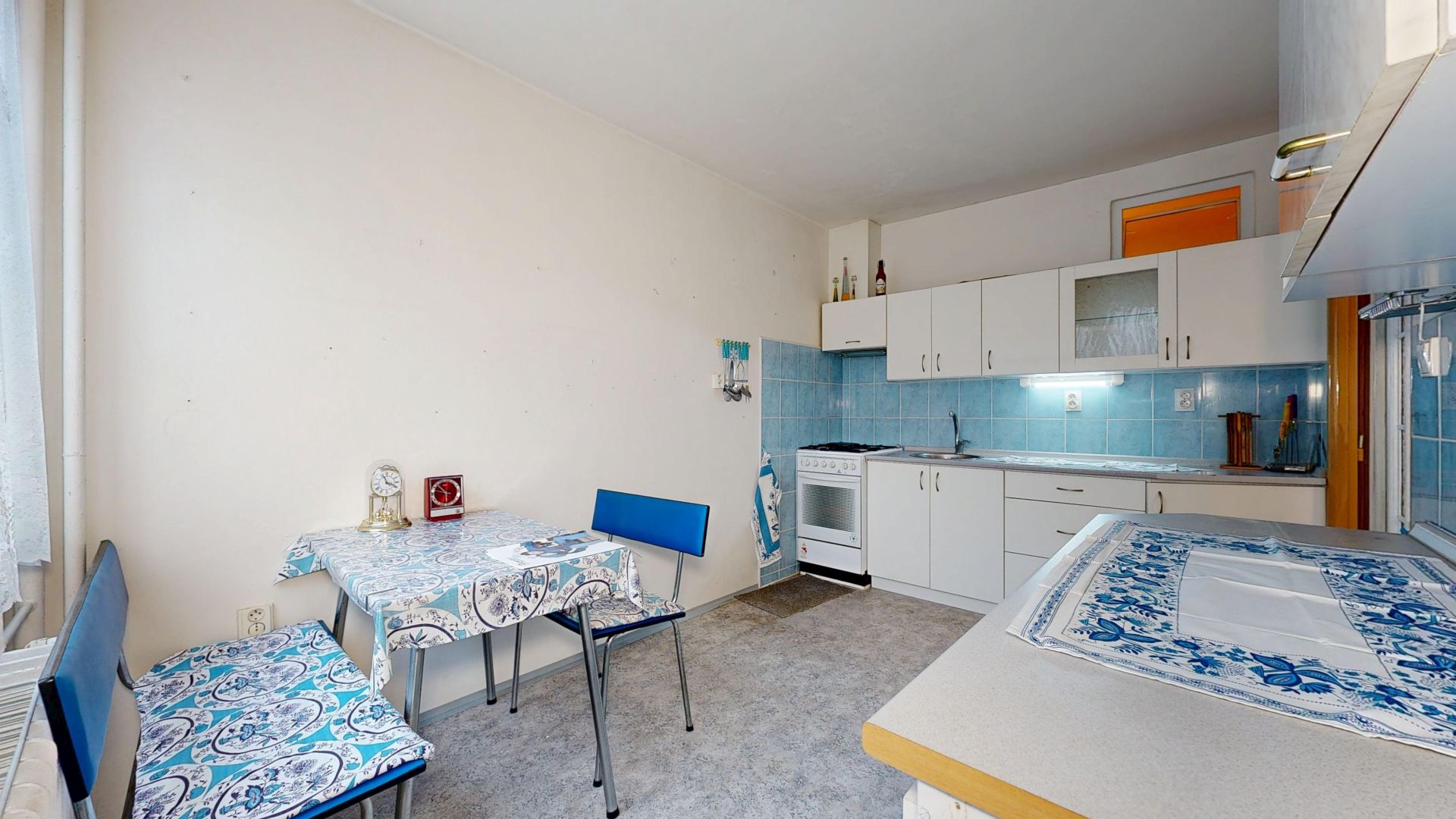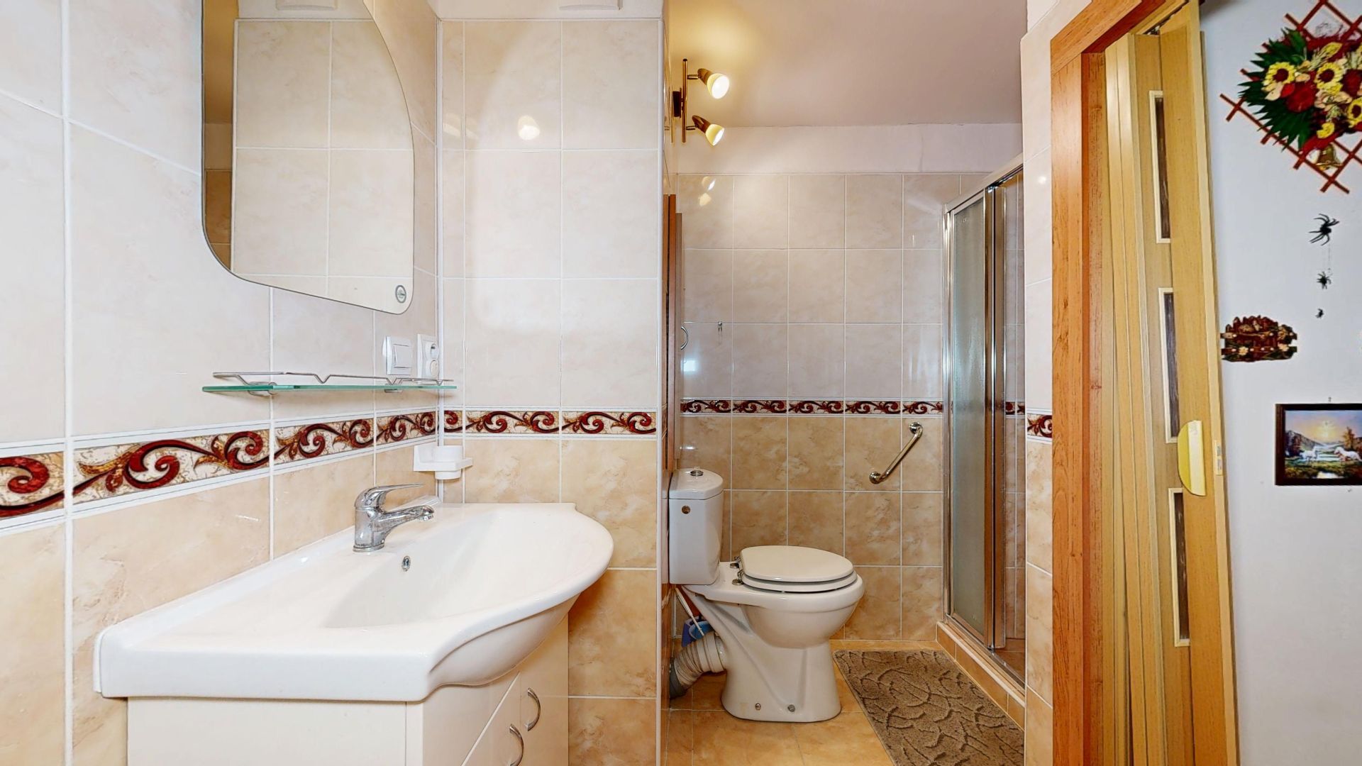 Interiér bytu je velmi dobře udržovaný. Podlahy jsou řešeny kombinací dlažby a plovoucí podlahy, což zajišťuje nejen příjemný vzhled, ale i snadnou údržbu. V chodbě byla nově položena dlažba, která dodává prostoru elegantní a čistý dojem. Byt disponuje zděným jádrem a nově zrekonstruovanou koupelnou. Praktickým benefitem je komora přímo v bytě a další komora umístěná na společné chodbě, která poskytuje další úložný prostor.